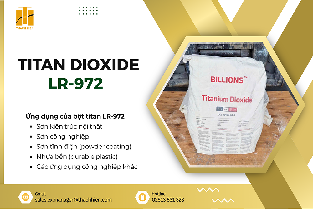 Bột titan LR-972 (LOMON® LR-972) là dòng titanium dioxide (TiO₂) rutile, được sản xuất bằng quy trình sunfat. Sản phẩm có lõi cấu trúc tương tự R-996, nhưng được xử lý bề mặt bằng silicon dioxide và alumina nén chặt kết hợp xử lý hữu cơ, giúp cải thiện rõ rệt độ bền và hiệu suất sử dụng.