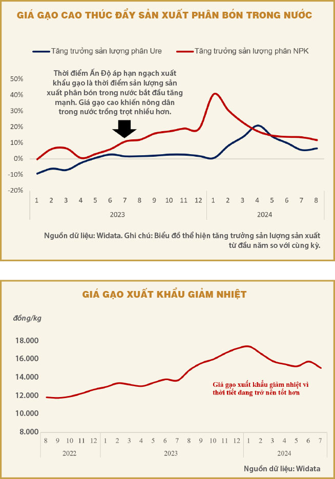 Trong những tháng đầu năm 2024, sản lượng phân urê đã tăng 6,5% so với cùng kỳ năm trước, trong khi sản lượng phân NPK tăng 11,7%. Nguyên nhân chính dẫn đến sự tăng trưởng này là giá gạo xuất khẩu của Việt Nam vẫn duy trì ở mức cao, tạo ra nhu cầu lớn cho phân bón. Kể từ đầu năm, giá gạo xuất khẩu của Việt Nam đã có lúc đạt mức 16.000 đồng/ký, cao hơn đáng kể so với mức 14.000 đồng/ký của năm trước.