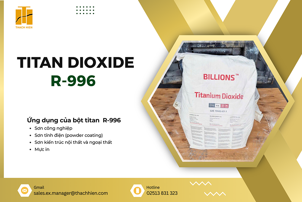 Bột titan BILLIONS™ R-996 là dòng titanium dioxide (TiO₂) rutile, được sản xuất bằng quy trình sunfat, có xử lý bề mặt zirconia và alumina, kết hợp xử lý hữu cơ. Đây là dòng pigment có độ bền cao, tính đa dụng tốt, phù hợp với nhiều ứng dụng công nghiệp khác nhau.