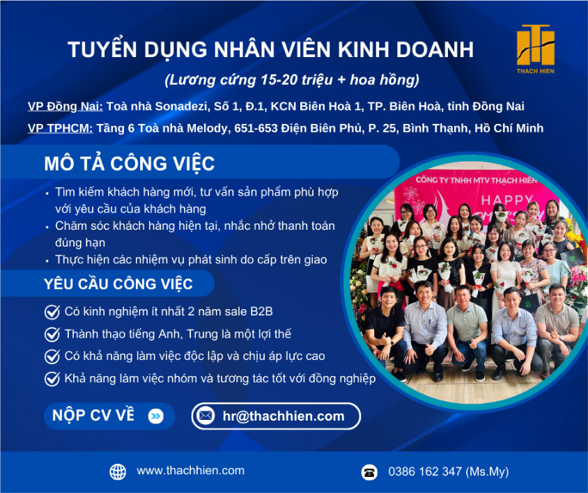 -> Nộp CV ứng tuyển về Gmail: hr@thachhien.com hoặc liên hệ Zalo: 0386162347 (Ms.My)